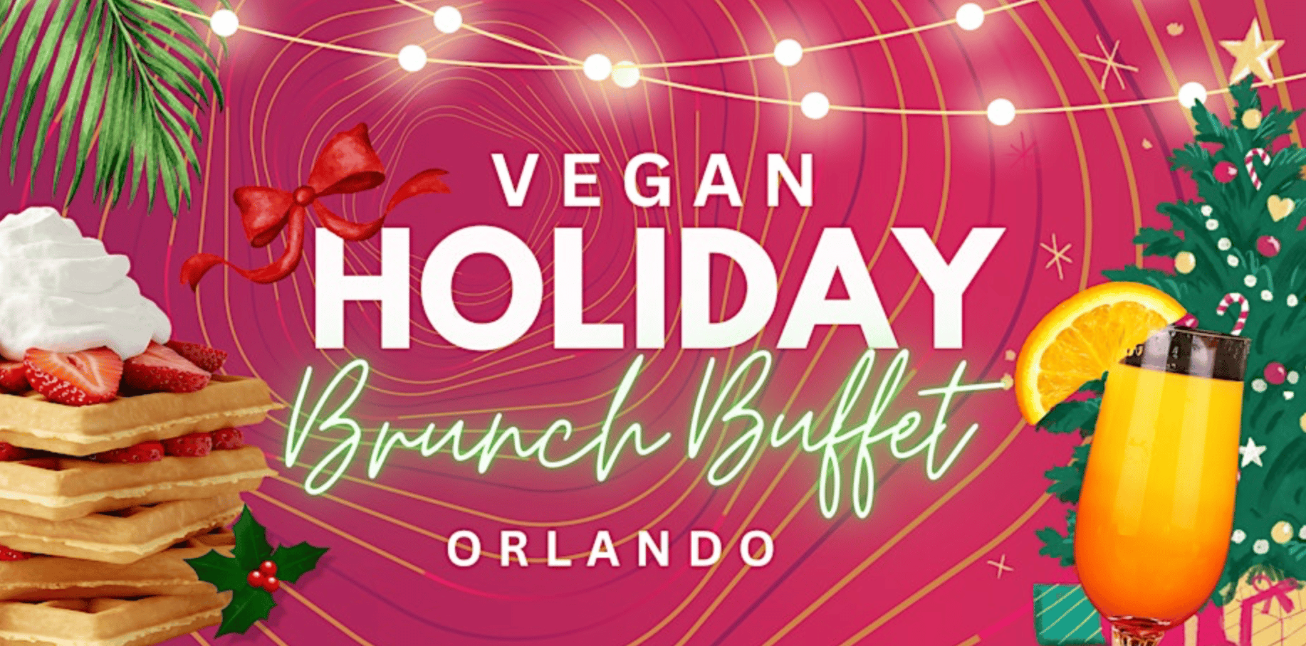 This is an Epic Vegan Holiday Brunch at Karelyn's Vegan Restaurant in Orlando, Florida. It's a festive, all-vegan buffet featuring southern comfort foods, nostalgic favorites, live soulful holiday music, a holiday raffle, and a community toy/food drive. The event includes unlimited vegan food options, mimosas (add-on), and a giveback initiative (donate toys or non-perishable food to earn a free dessert).